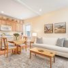 This spacious living area combines cozy upholstery with the clean lines of light wood cabinets and white moldings. A large flat screen TV, Bose Stereo and Wi-Fi ensure that you’ll be entertained while home. Come evening, the wall unit transforms into a comfortable queen-size bed in crisp linens.