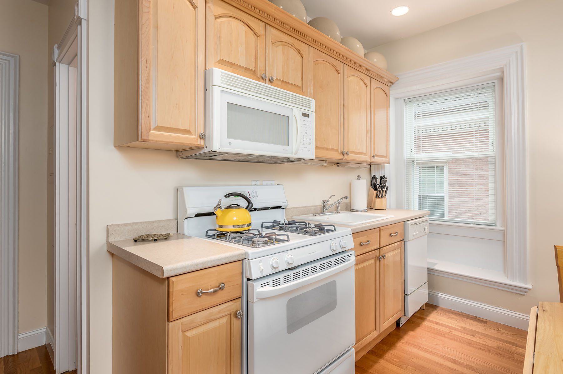 The fully applianced kitchen’s maple cabinets and built-ins make cooking a pleasure. Simple wood details, local art and distinctive lighting complete the sophisticated urban decor.