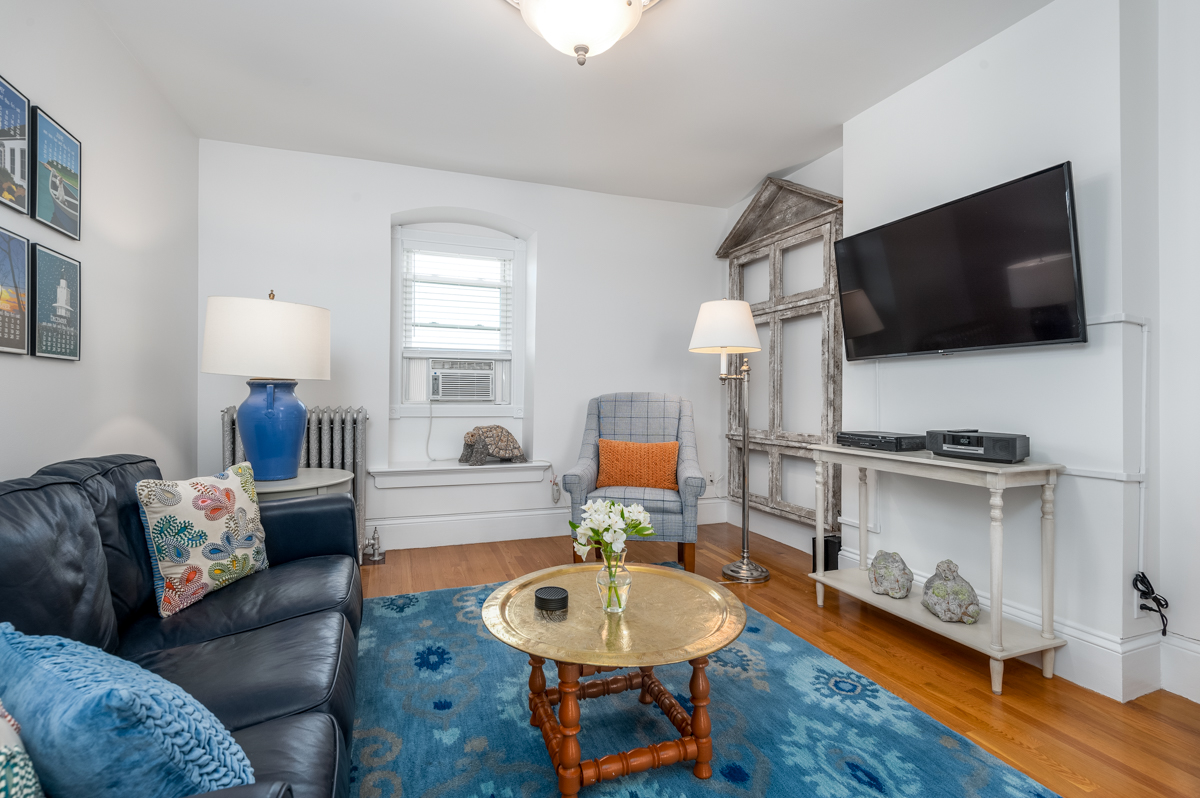 This one bedroom, one bath with a loft has spectacular views of the city and the Back Cove from its private deck. The interior has a beautiful coastal cottage feel and features pieces of local Maine artwork and custom rustic décor. The open living space is comfortable and stylish, and the high ceilings combined with crisp white walls reflect the natural light coming in from the recessed windows.