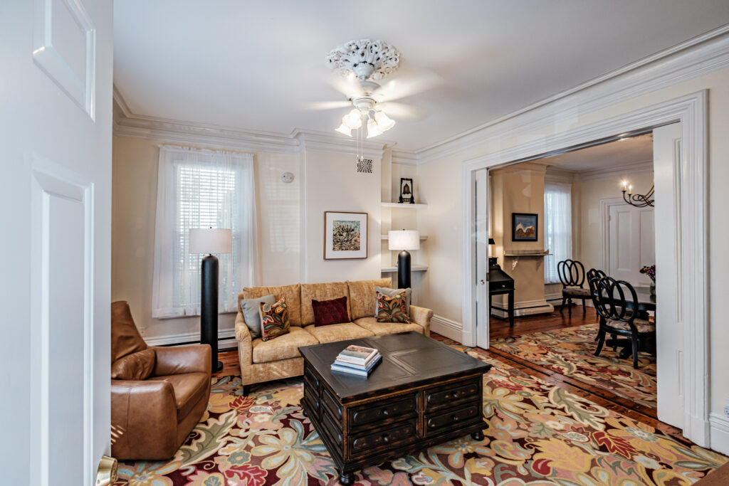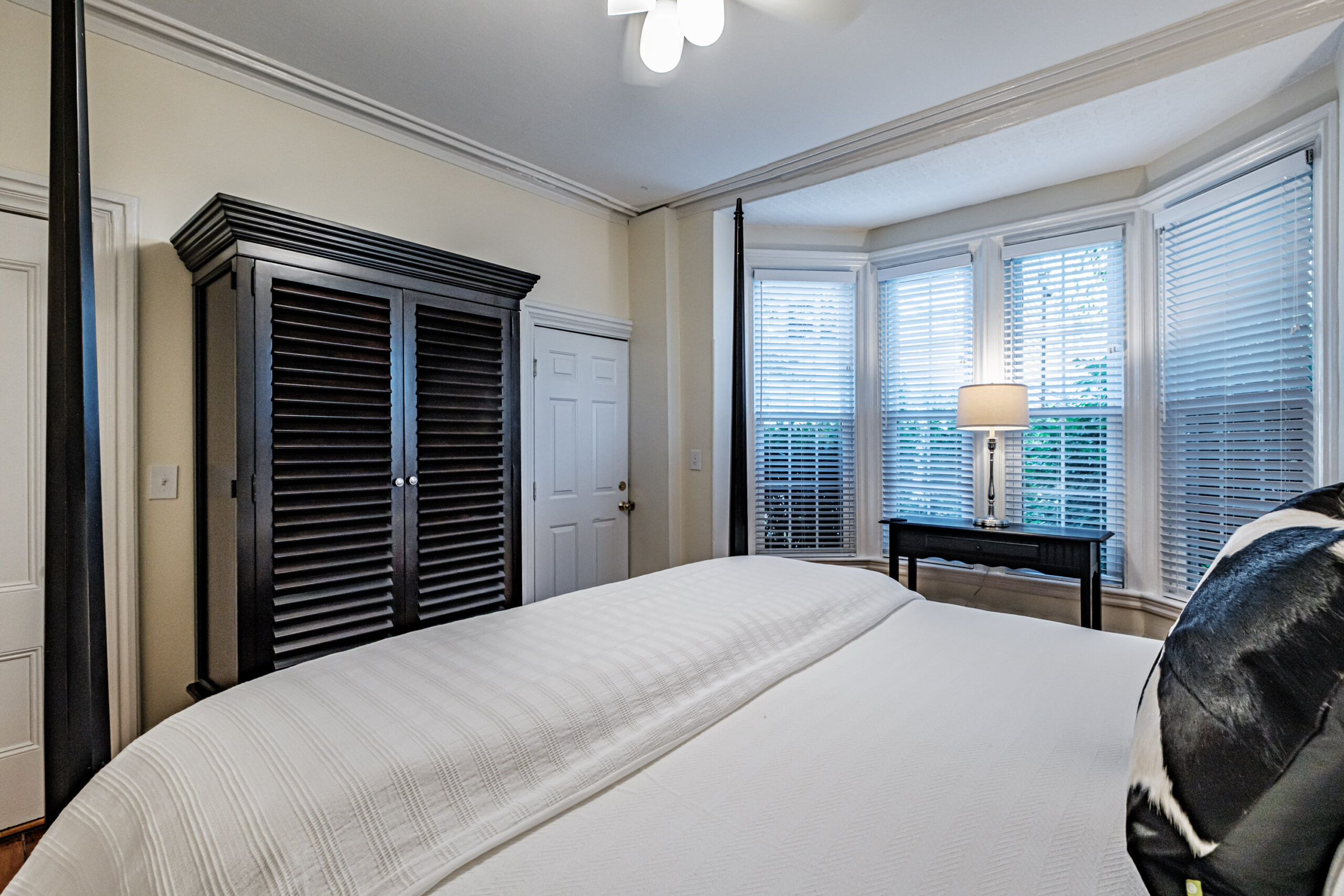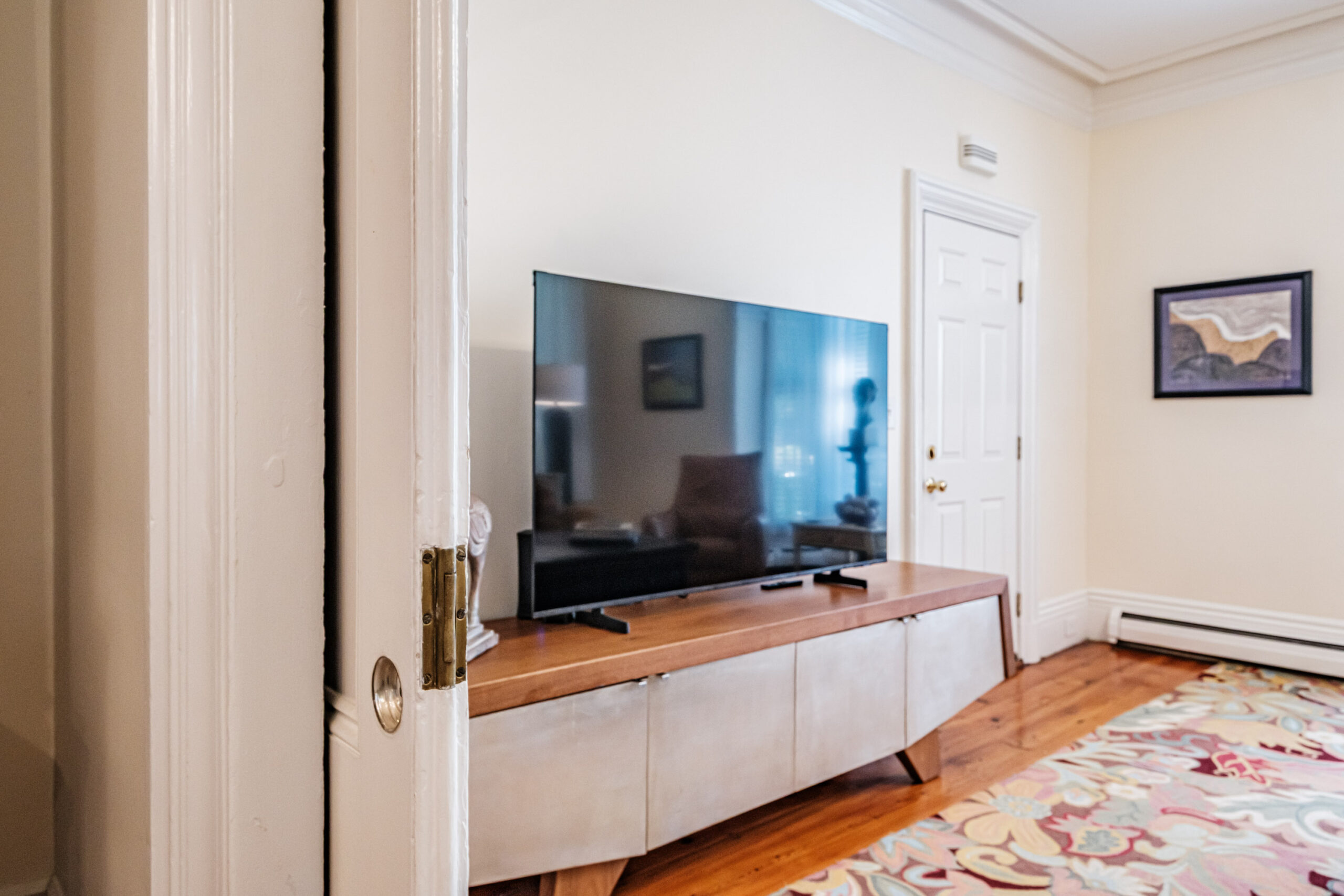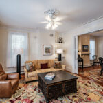 This spacious one bedroom apartment is elegantly decorated from the hardwood floors to the tall ceilings trimmed with crown molding. Large bay windows in the living room and bedroom allow for plenty of natural light and a thoughtful mix of autumn tones, rich textures and Company C rugs create a depth of warmth and character.