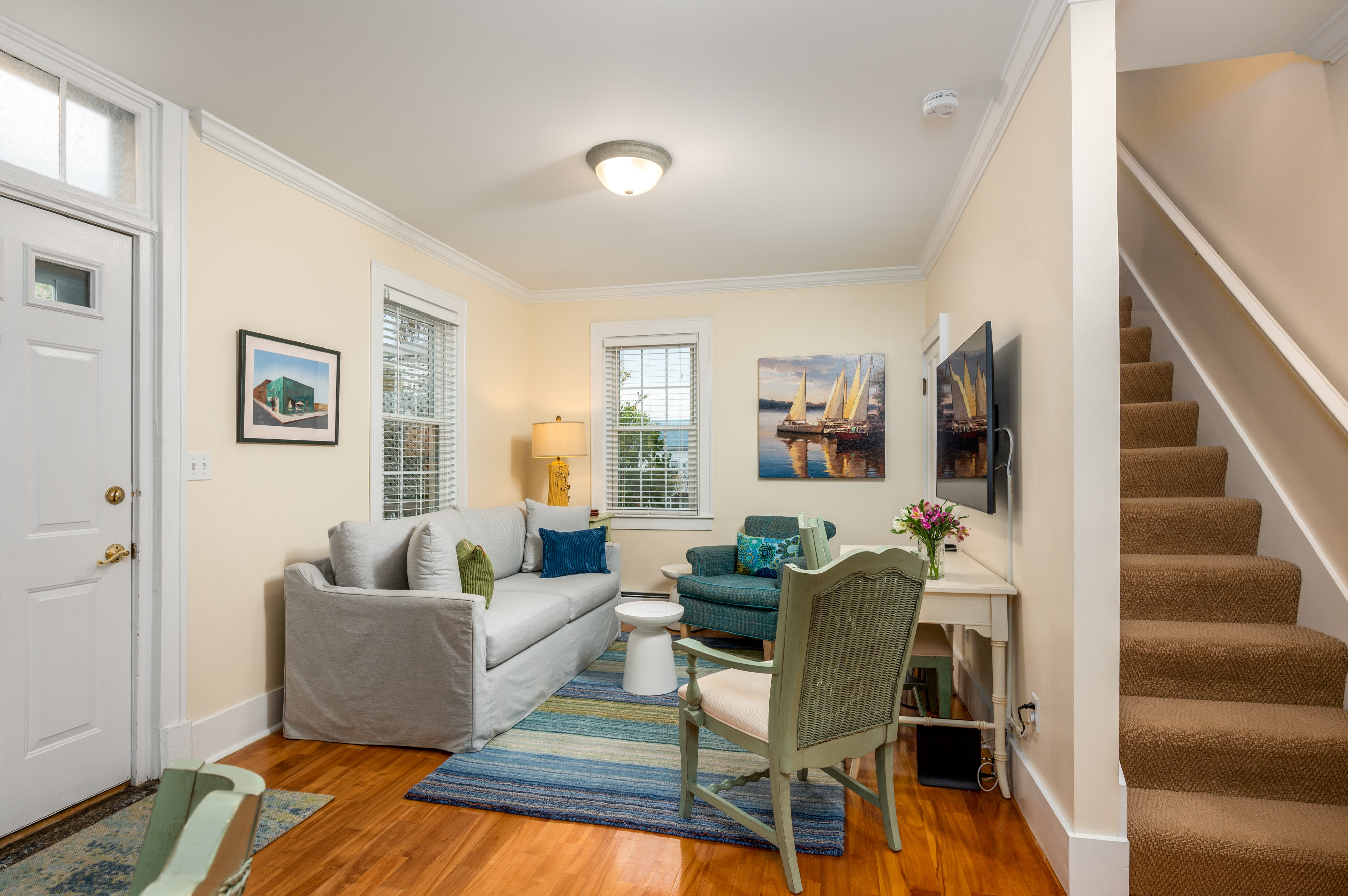 This downtown apartment features an abundance of natural light and hand selected furniture from local shops throughout Southern Maine. The essence of the city’s historic charm resonates throughout the unit with unique details, including a stunning interior stained glass window and an exposed brick wall.